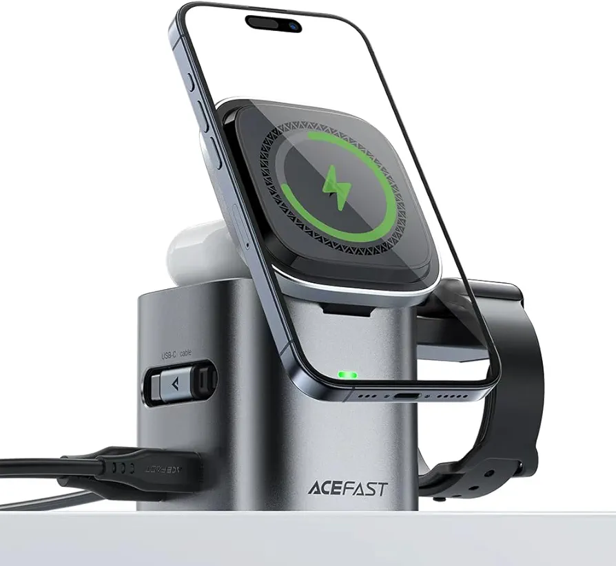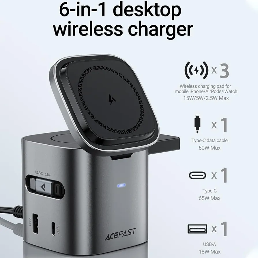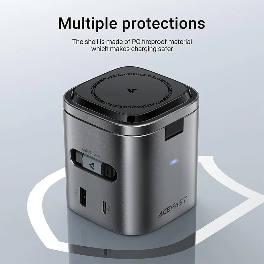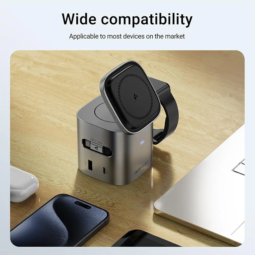 A estação de carregamento ACEFAST utiliza tecnologia GaN (Nitreto de Gálio), oferecendo mais potência, menor aquecimento e maior eficiência energética.